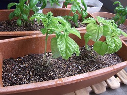 上の方、白い花が咲いてます。 スイートバジル組です。かなーり伸びてます。