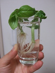 スイートバジルはまた上の方の芽を摘んで、発根させるべくお水に浸けています。